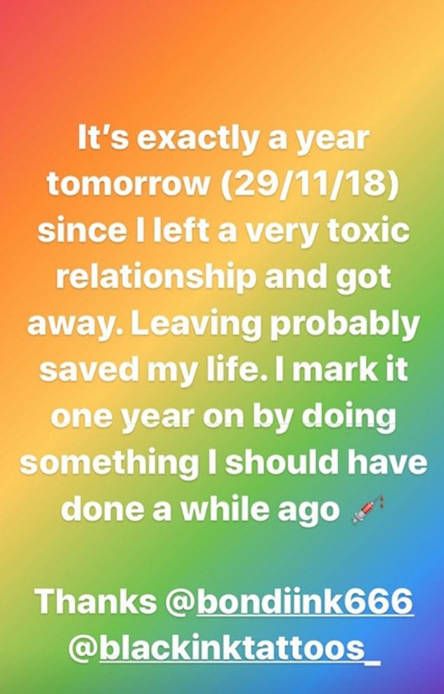 He posted on his story: “It’s exactly a year tomorrow since I left a very toxic relationship and got away. I mark it one year on by doing something I should have done a while ago.”