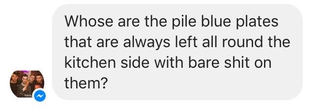 Not too dissimilar from the serial passive aggressive note leaver, the flat group chat aggravator has stepped up their confrontational game and entered the 21st century. Every single grain of rice that has just been kicked under the kitchen counter is a personal attack on them and their integrity and they are about to let you know about it in a string of lengthy WhatsApp messages, backed up with photographic evidence and a vivid description on just how you have ruined their life this time.