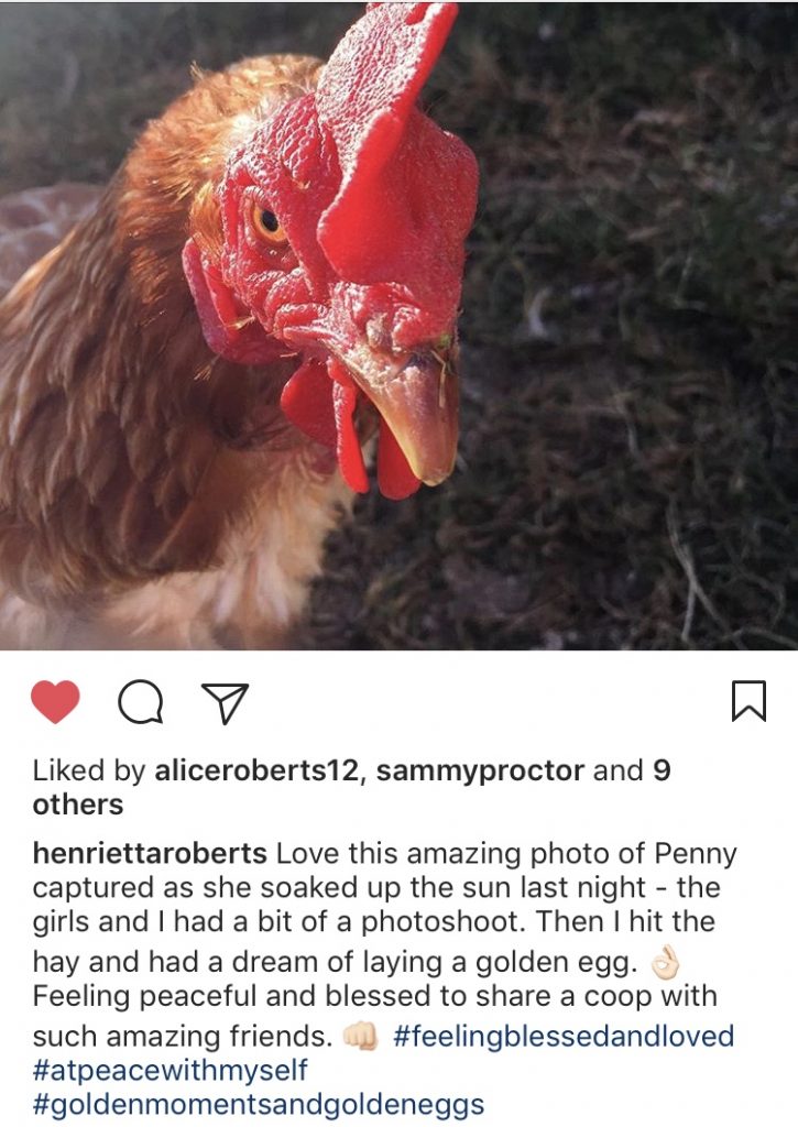 My hen, Henrietta, has her own Instagram account. It’s totally transformed her life: she’s finally been able to express herself, celebrating coop life from inside and out. Fashion? Politics? Celebrity inspiration? Fitness? It’s all there.