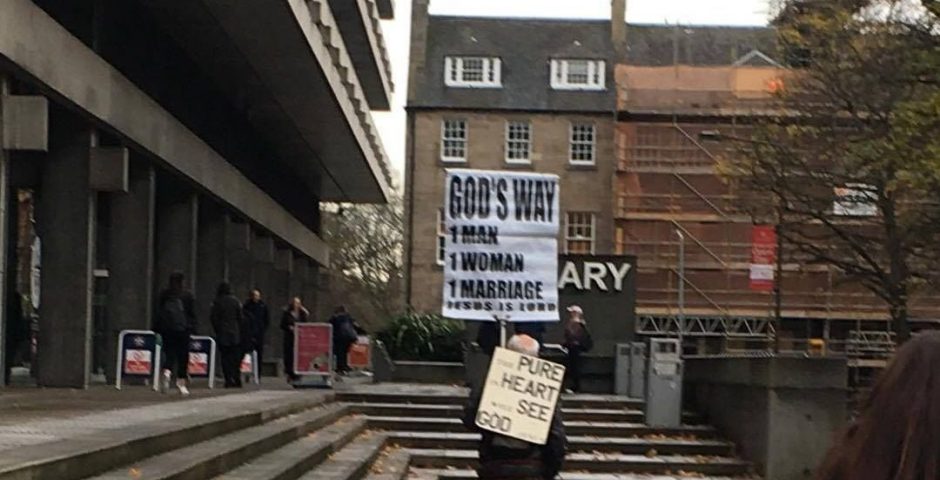 This morning a man was spotted walking around George Square with a sign saying “God's way: 1 Man, 1 Woman, 1 Marriage.”