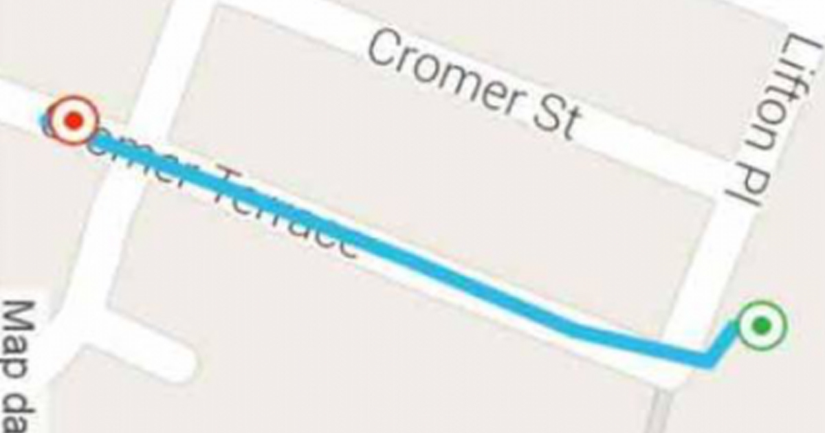 The taxi went from Lifton Place at the top of the Union along Cromer Terrace to their accommodation.