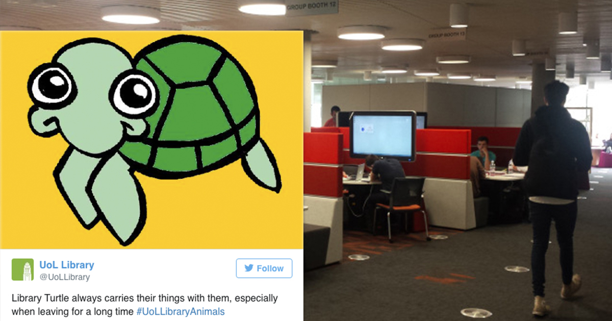 According to the library’s twitter account @UoLLibrary we are now all animals and the “Library Turtle always carries there things with them”.
