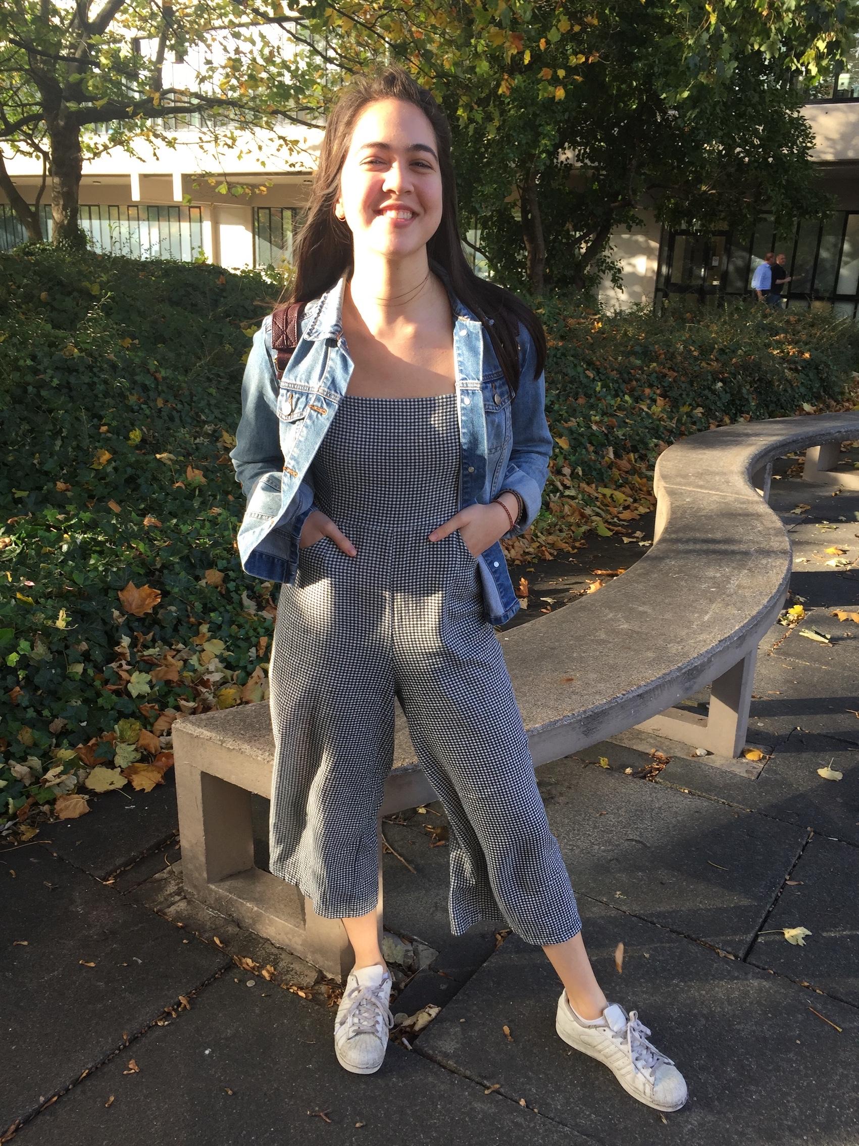 The cutest little monochrome jumpsuit that goes hand-in-hand with a demin jacket. This Aussie may be used to birkenstocks and a bikini but she can clearly dress for an English city too.