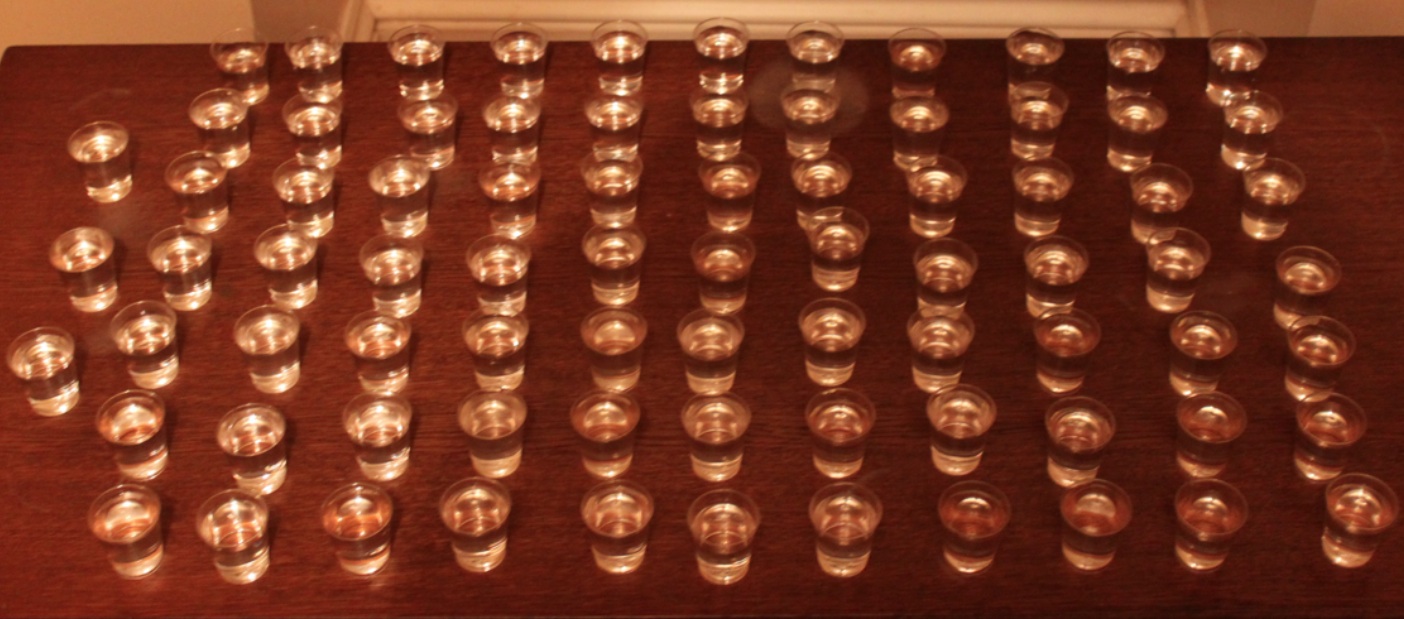 It’s pretty daunting. 80 shots arranged on a table; some are water, some are vodka…one is Ouzo. When there are nine other players the amount of time you get to rid yourself of the horrific taste of Red Square is just about long enough. You might think you’re lucky to pick three water shots in a row, but the penalty for such an act is of course, more vodka.