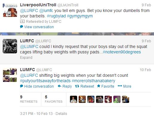 Liverpool is no exception to the notorious rugby/football rivalry, as Liverpool University Rugby Football Club (LURFC) hit out at Liverpool University Men’s Football Club (LUMFC) over their gym habits.