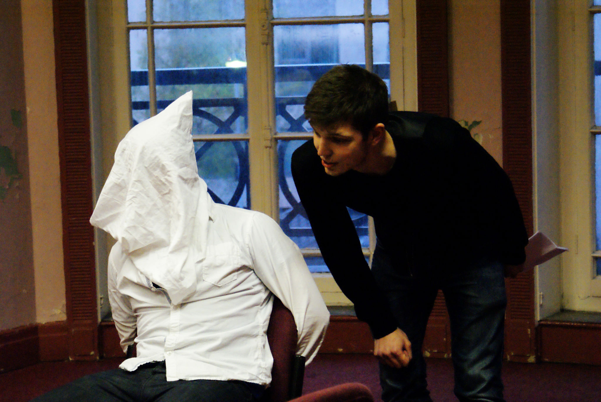 Next on agenda was ‘It’s Just a Game’. In this Vietnam style ‘bag over the head’ questioning scene, rather than seeing the classic desperate shrieking and pleading you would expect, the wonderful writing of Alex Ferguson somehow manages to create a rather entertaining comedy. Special mention should also go to Geraint Williams who I can only describe as a cross between Mr Blonde and David Walliams.