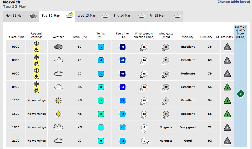 The big freeze that struck Norwich this weekend – after a warm spell last week – is set to continue, with wind gusts of up to 36mph making it feel like -9C until 6am tomorrow morning.