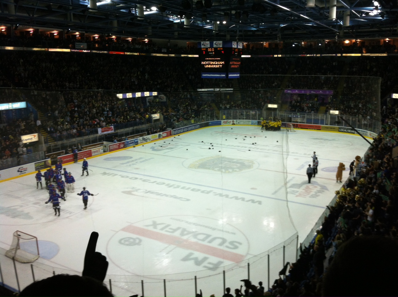 Varsity Ice Hockey is the most attended University Ice Hockey match outside of North America. 7000 fans were packed into the Capital FM Arena to see the Nottingham Mavericks win 4-3 to chants of “we pay your benefits” and “what’s that coming over the hill, it’s unemployment.”