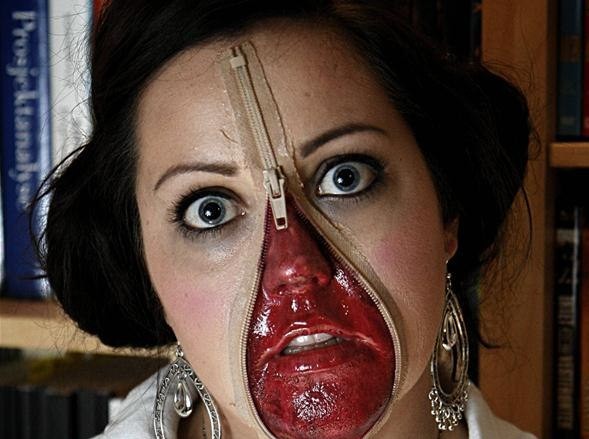 This costume is pretty quick and easy, and the effect is utterly revolting. Also, it’s only on your face, so you are free to wear what you want. Alternatively, take the joke too far and have the zip run down your whole body.