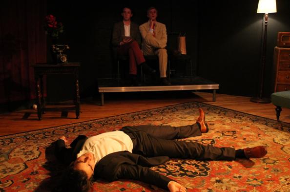 Not much did. Major Muldoon’s flimsy wooden wheelchair did collapse mid-exit, leaving a panting Inspector Hound to drag him from the stage amidst a trail of prop debris. The Major (Dugald Young) was forced to temporarily regain the use of his legs in order to drag in a shiny replacement and Inspector Hound (Peter Huhne) looked a bit sweaty on his return, but things soon calmed down again.