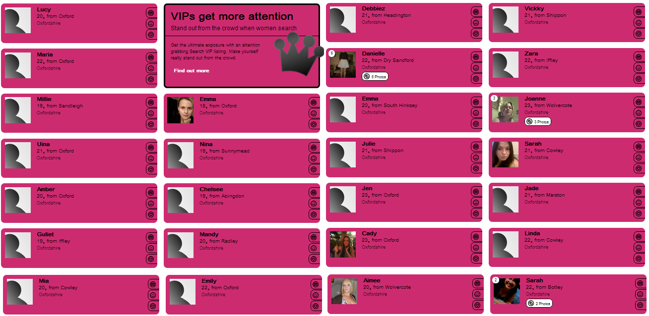 Using the site’s basic search function, I discovered that there are only 55 women aged between 18 and 23 within five miles of Oxford. Here’s a selection. Can you spot any tutorial partners? Yeah, thought not.