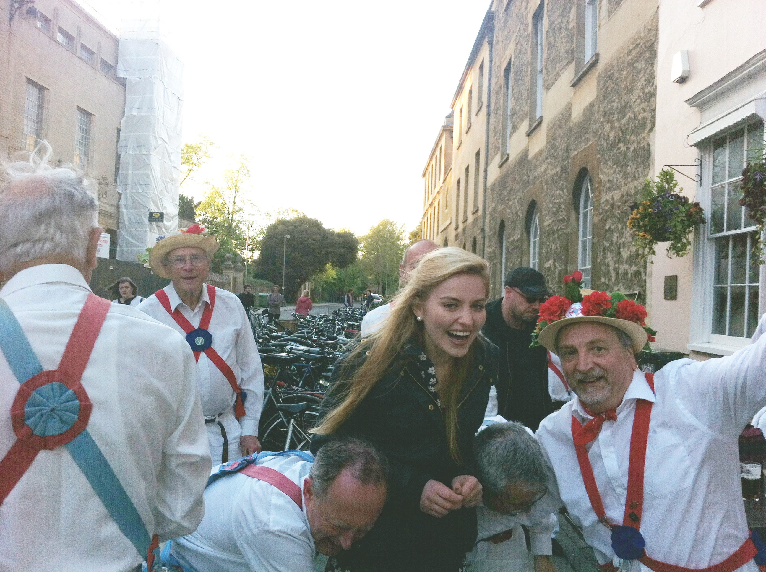 I stood on Parks Road, surrounded by about 12 male dancers, playing the part of the ‘Maiden’. Crowds of passers-by began to gather around us and at the end of the dance I became visible to all, as the men lifted me in the air and spun me around.