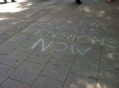 Duff was campaigning for fairer working conditions for outsourced workers employed by the university, such as improved sick pay and holidays. She wrote her slogan using decidedly impermanent chalk.