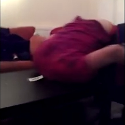 In a spectacular showing of intellectual prowess, a student has been videoed smashing his head through a sitting room table.