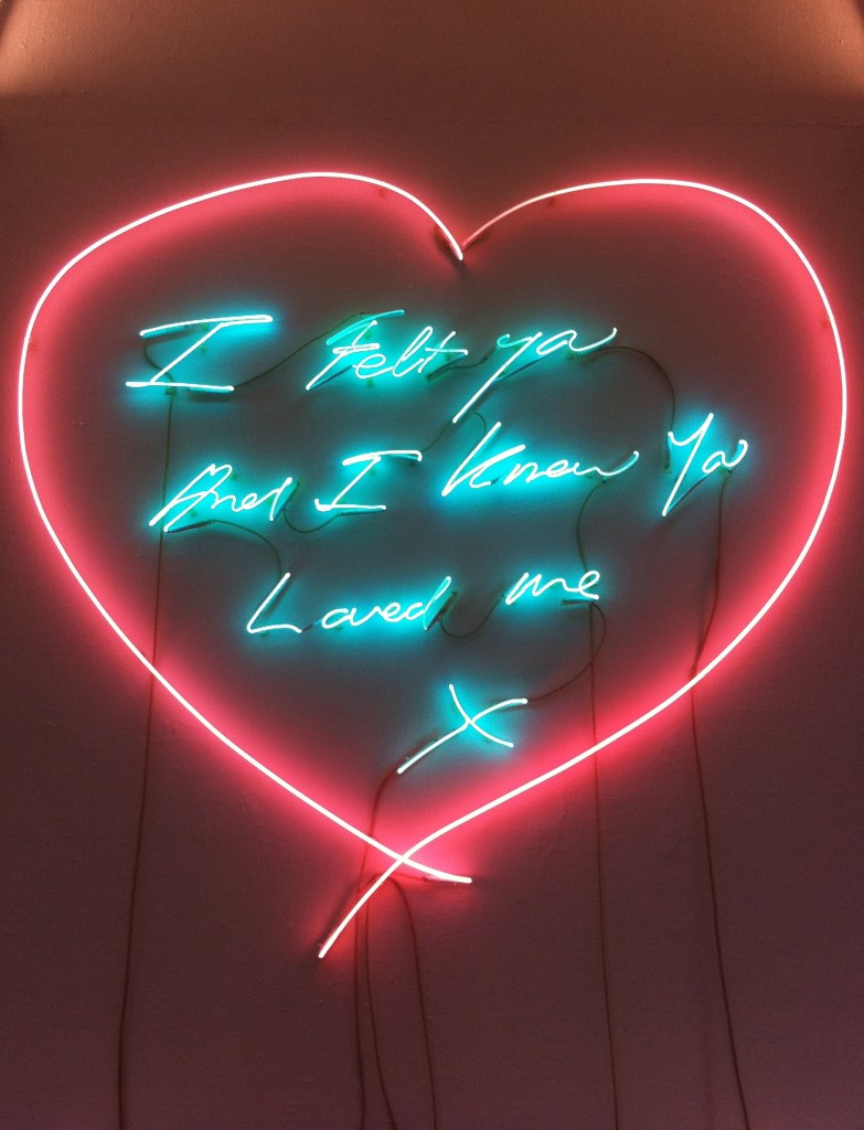 A short walk and we were at the gallery itself, which was larger and more prestigious than anticipated. Tracey Emin welcomed visitors – her work hanging on the back wall of the atrium, directly opposite the entrance and lit neon like a 1950s diner. It addressed us directly: I felt you and I knew you loved me x. Personal and anonymous with its single kiss. We were sold; there was a signature Tracey Emin and it was curated in such a way as to distract me from cakes in the gallery café. We were drawn in by contemporary works alternating between the tender and horrifying. There was a set and place-named dining table for Females of the French Revolution, a seemingly burnt face staring out of a canvas and an intimate painting of a crumpled duvet cover in photographic detail. Damien Hirst, David Bailey, photos, paintings, collage, sculpture – it had it all.