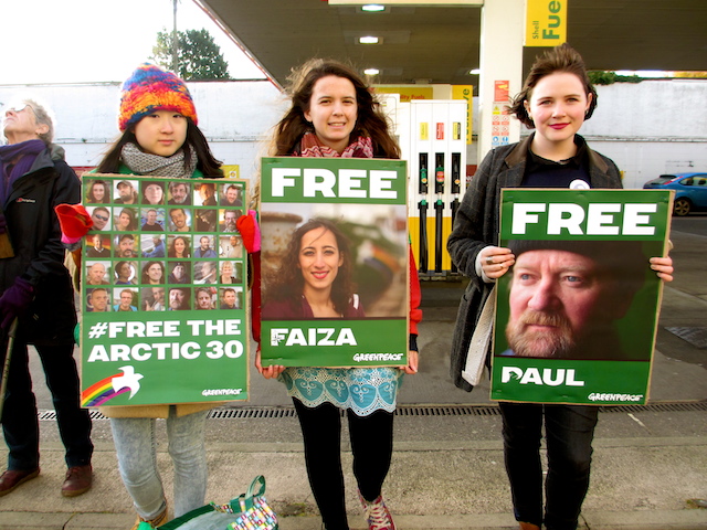 Today, Greenpeace supporters held protests at over 70 Shell petrol stations across the country.The protests are part of a global day of action in solidarity with the Arctic 30, taking place in dozens of countries around the world.The protests are taking place to pay tribute to the two journalists and 28 Greenpeace activists being held in St Petersburg, charged with piracy and hooliganism. Greenpeace ctivists state that The Arctic, the climate and the right to peaceful protest must be protected.