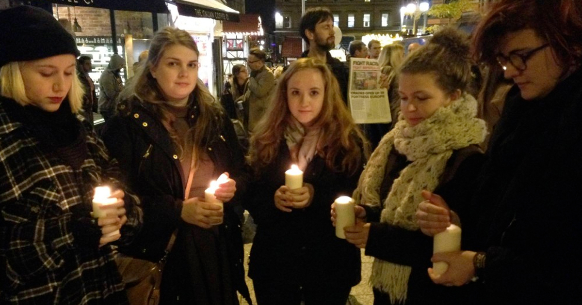Around 200 people attended a candle-lit vigil in Old Market Square last night to show solidarity with the people of Paris, Beirut and Baghdad.