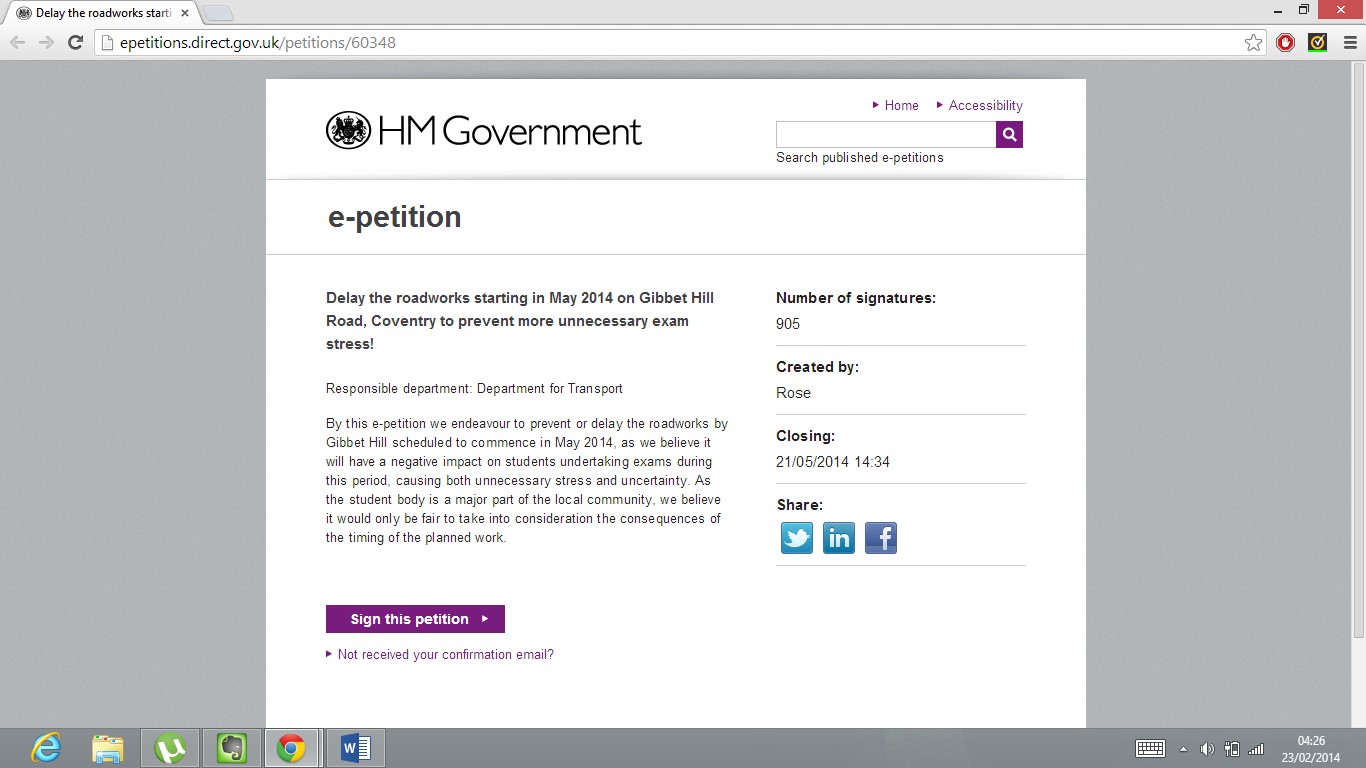 “By this e-petition we endeavour to prevent or delay the roadworks by Gibbet Hill scheduled to commence in May 2014, as we believe it will have a negative impact on students undertaking exams during this period, causing both unnecessary stress and uncertainty. As the student body is a major part of the local community, we believe it would only be fair to take into consideration the consequences of the timing of the planned work.”