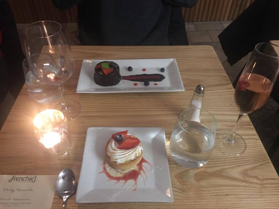 Everyone will be satisfied. Frenchie offers a variety of bistro-sized desserts, like the lemon meringue pie with strawberry syrup, the chocolate cake, and the white chocolate and red fruits tiramisu.