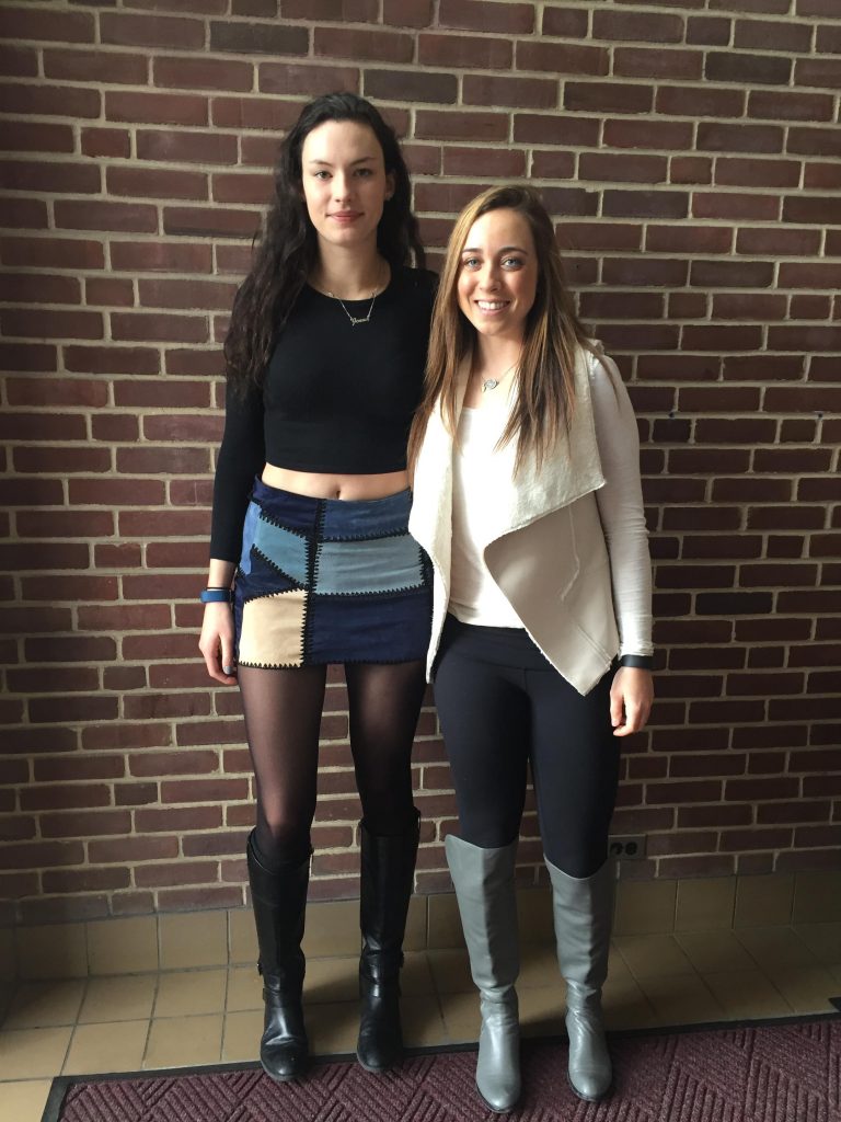 Spotted in the ELC, Jenna Walpole wears a Zara skirt and Vince Camuto boots. Audra Adams has on Lululemon leggings and a vest from Express. Her shoes are Michael Kors.