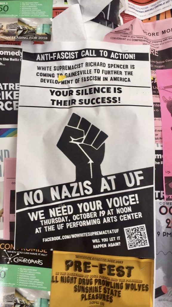 When President Fuchs announced the possibility of Spencer speaking on campus, Emerson created the Facebook event “No Nazis at UF” to organize protests. The event has over 2,000 people registered as going and over 6,000 that are interested. There are regular posts providing updates about the situation. The page states that it is “a coalition of students and community organizers committed to anti-racism on campus.”