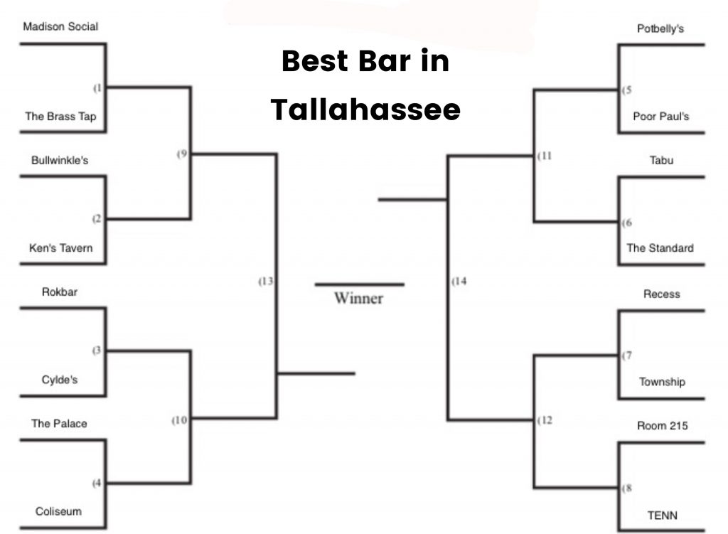 We gathered the 16 most popular and beloved bars among FSU students and given them head to head match-ups, to compete for the opportunity to be crowned The Best Bar at Florida State. Fill out your bracket each week to see if your bar goes all the way. Winner of our Best Bar in Tallahassee competition gets a custom trophy and bragging rights.