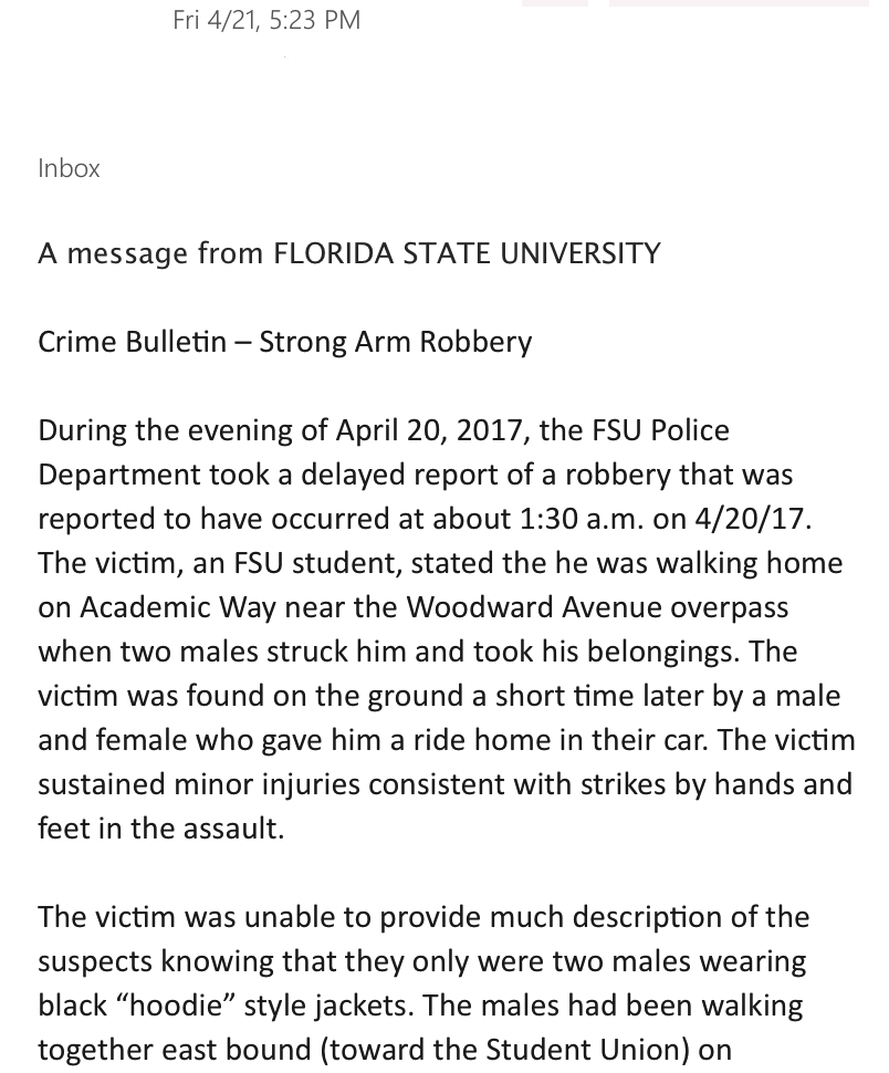 On April 21st, FSU alerted students to an armed robbery that had happened more than a day earlier, with no warning of the situation at the time.