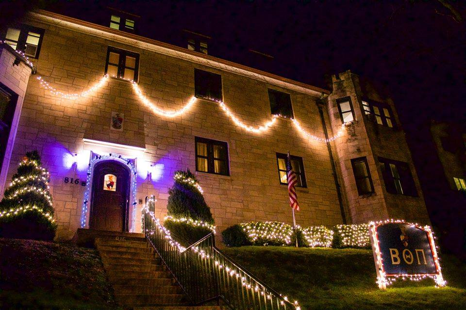 The Beta Theta Pi house, located on the east side of campus, lit up for the holidays