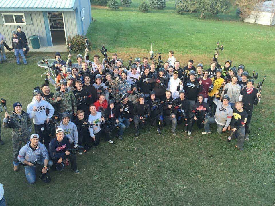 The Kappa Sig’s take a group photo after a paintball outing