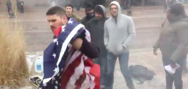 As seen in the video, a man dressed in a FedEx uniform appears with a fire extinguisher, puts out the fires and confiscates one of the flags as he argues with the protesters. A University of Iowa student confronts the protesters, shouting “This is not how you unite a country.”