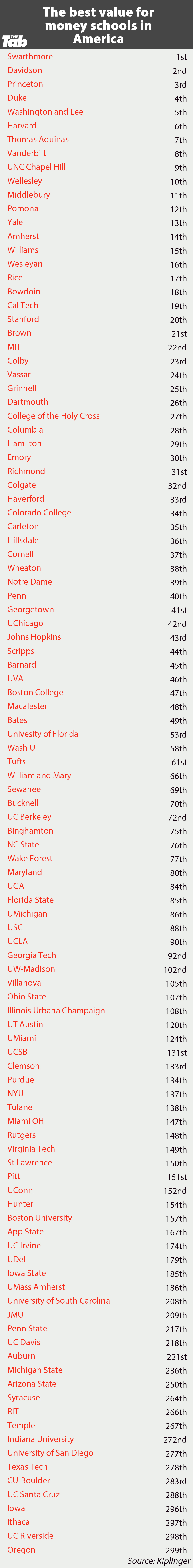 Kiplinger, a business publisher based in Washington DC, revealed the top colleges that give value for money – a ranking based on data on admissions, the total cost of studying there, financial aid available, debt upon graduation and expected salary.