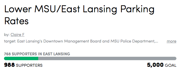 After talking with Claire about why she created the petition, the 20 year-old said, “My goal with the parking petition is to rally MSU students(and EL residents) together to recognize and subsequently lower the current rates for parking on campus and downtown, and decrease the ticketing habits of PACE and the MSU parking enforcers.”