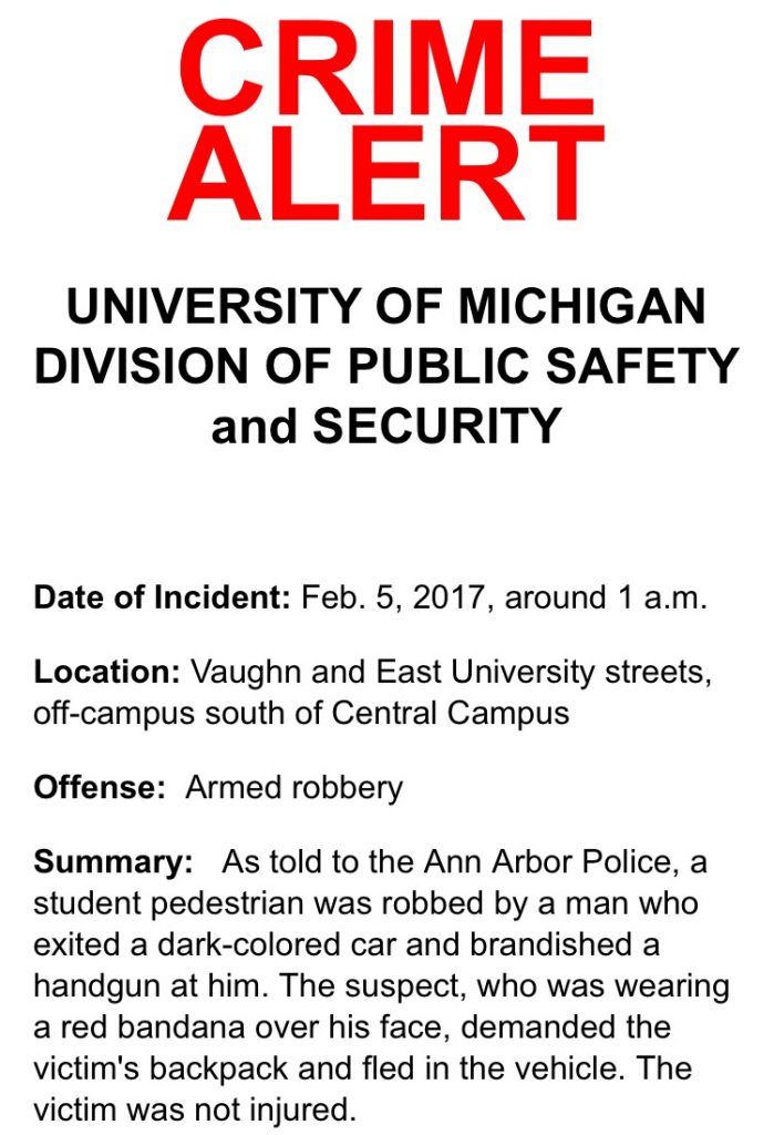 Umich students are used to a certain level of danger that comes along with being a college student—the occasional laptop stolen from the Ugli, “suspicious characters” wandering after dark, etc. But some Crime Alerts from the past couple weeks have many students fearing for their safety, as armed robberies have been reported multiple times near the Oakland area.