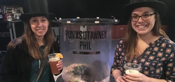 The crowd at Café was definitely unique. Men in top hats greeted us, gave us coins inducting us into the “Punxsutawney Groundhog Club” and of course gave us a sample of the “Philsner,” which honestly wasn’t half bad. Phil was kept in a plastic dome, while children (yes actual children were in Café), students and adults all waited in line to meet the hog—who was sleeping and not in the least bit interested or proud of his accomplishments. Shame.