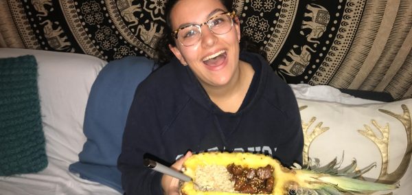 Next, chop your chicken breast into 1 inch cubes and cook in a frying pan with a little olive oil over Medium-High heat until fully cooked (3-4 minutes approximately). Next, combine 1/4 cup brown sugar, 1/2 cup soy sauce, and 1/2 cup honey into the pan with the chicken, mix together, and bring the contents to a boil. For extra flavor, toss in some pineapple chucks and some pineapple juice from the insides you scooped out! Once boiling, reduce the heat to Medium-Low and let simmer for around 10-12 minutes until the sauce is thick.