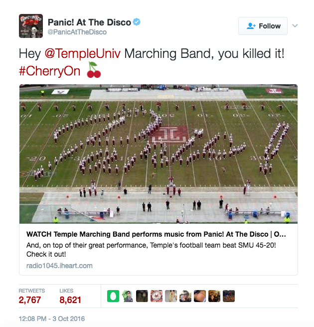During one of their home games against USF, the band marched on the field and delivered a rendition of multiple Panic! at the Disco songs. The recording of their performance has since received over 500,000 views on YouTube and recognition from Panic! at the Disco themselves on Twitter.