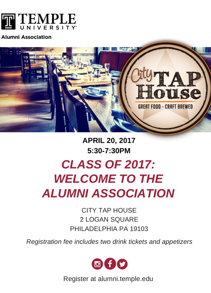Current seniors are invited by The Temple Alumni Association to the Class of 2017: Welcome to the Alumni Association Happy Hour on Thursday, April 20, 2017 from 5:30–7:30 pm at the City Tap House Logan.