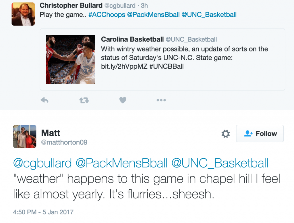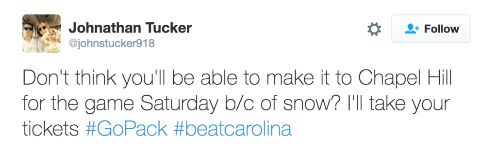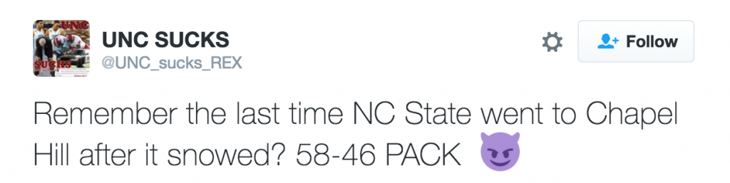 With predictions of up to 7 inches in parts of the triangle, and our game against NC State on Saturday night, it’s no wonder Wolfpack fans are already reaching obnoxious territory. I mean they reach it pretty often, so it’s not too much of a surprise. Here are some of the worst tweets from Wolfpackers: