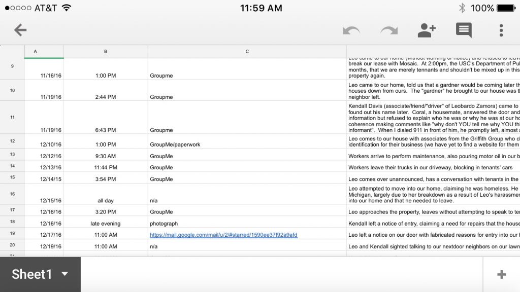 Here, a ledger complied by the tenants shows two visits by Zamora on Nov. 19, as well as on Dec. 16.