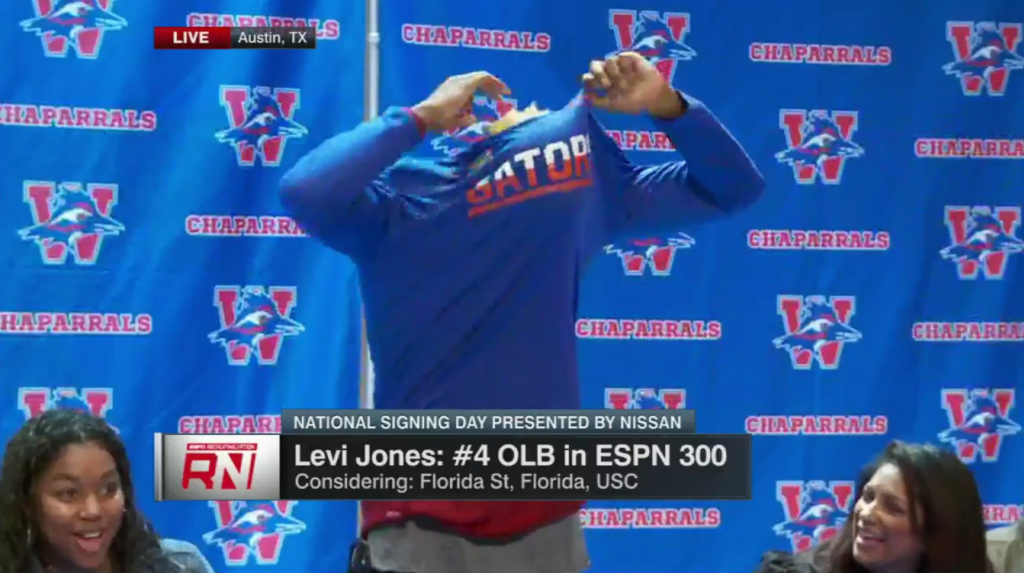 The 6’2″ player filled with 215lbs of jokes stood up on the signing day stage and took off a black zip-up hoodie to reveal a University of Florida Gators shirt. The crowd began to clap, but Jones was just getting started. He stripped himself of the Gators apparel to reveal a Florida State University Seminoles T-shirt underneath. But Jones was not there to attend FSU – he was there to FSU (F*&k S#$t up).