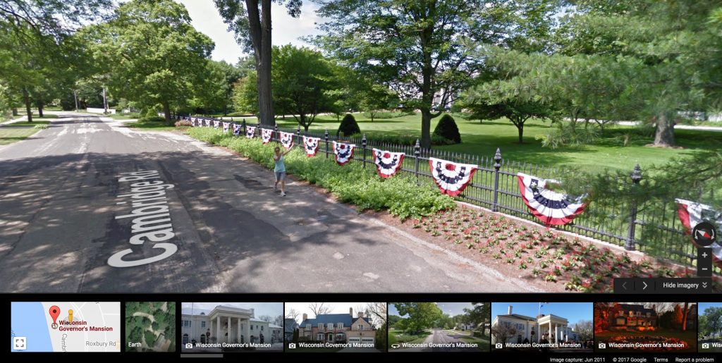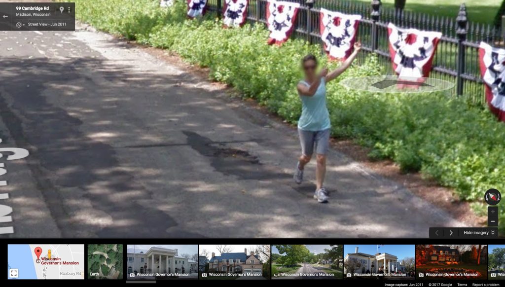 In Wisconsin heated politics has become a way of life, tensions have always been soaring in the midst of Governor Scott Walker’s controversial time in the Governor’s Mansion.With all of this being out in the World, we have been presented with a figure who speaks to the masses. This woman who saw the Google Maps car and leaped at the opportunity to vocalize, or rather demonstrate, her emotions at the state of politics. In the most clear, concise way she flipped the bird to the governors mansion for the Google Car to perfectly capture.