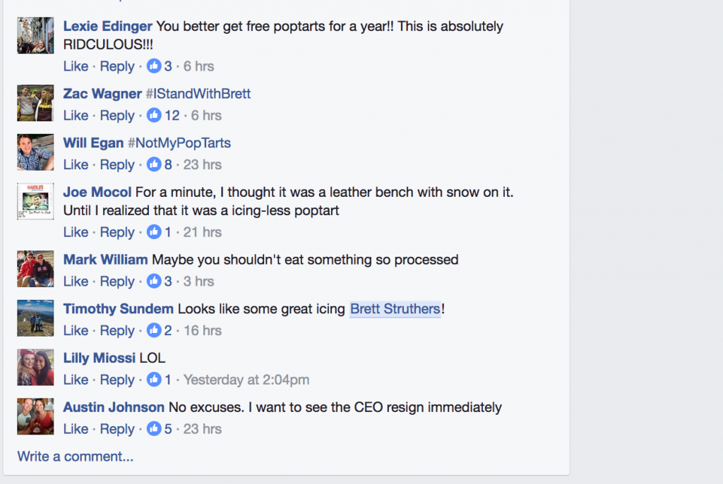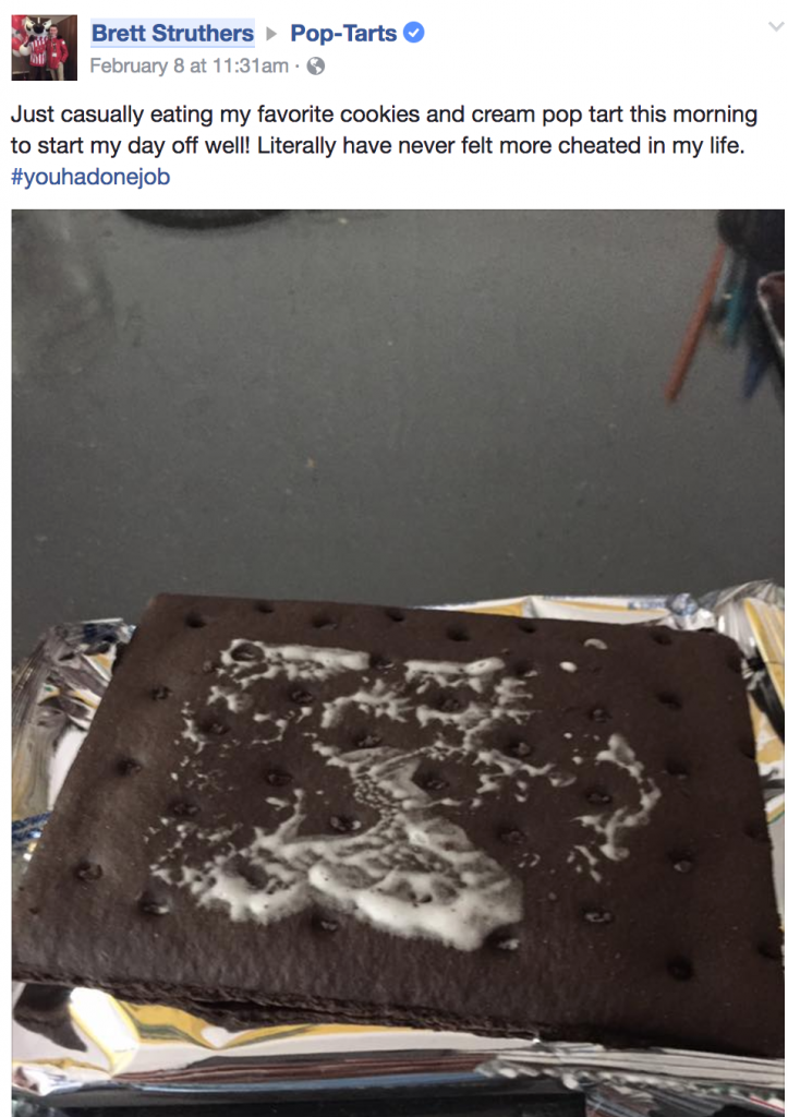 “Just casually eating my favorite cookies and cream Pop-Tart this morning to start my day off well! Literally have never felt more cheated in my life. #youhadonejob” Struthers posted on Pop-Tarts wall.