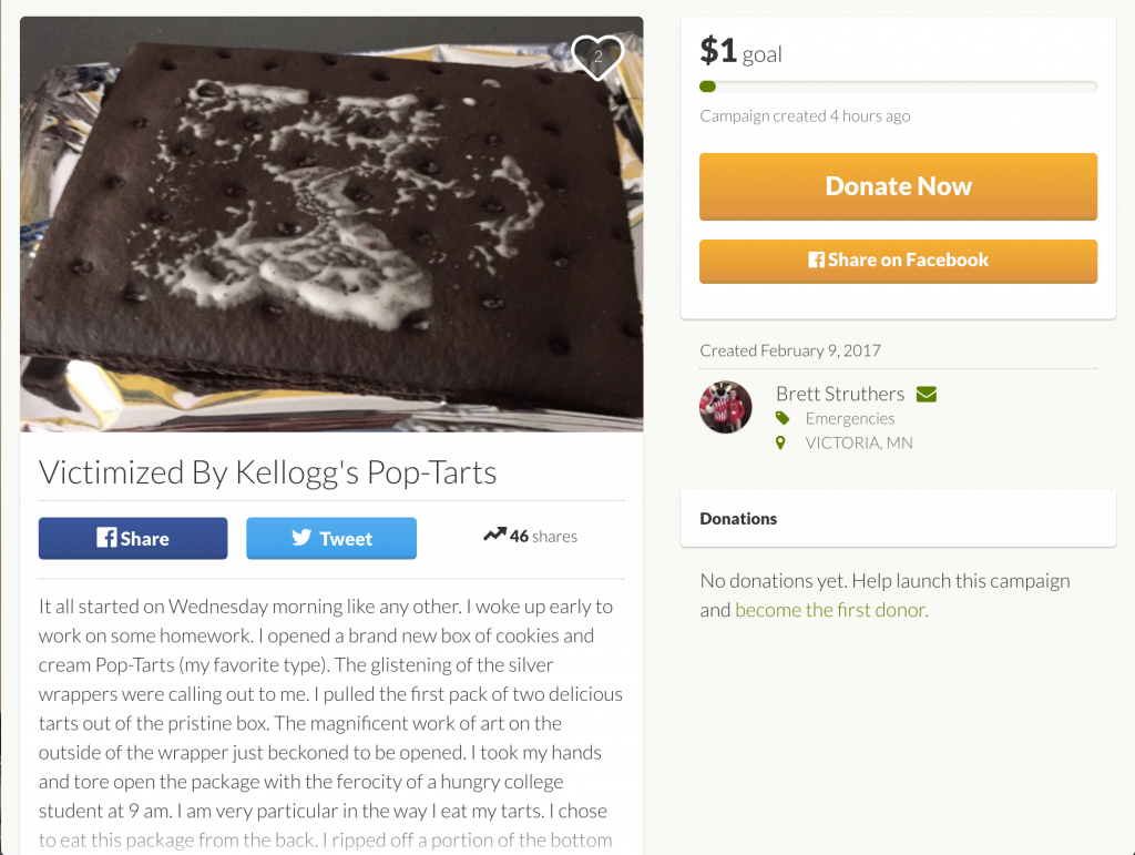 According to Struthers, Kellogg’s is sending him a coupon for a free box of Pop-Tarts, but before Pop-Tarts could respond Struthers created a gofundme for his trauma.