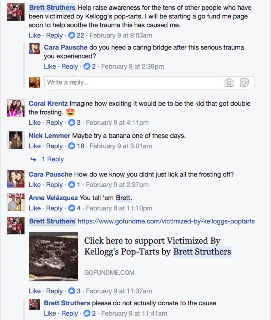 It all started on a February morning when UW-Madison student Brett Struthers decide he wanted to have a Pop-Tart for breakfast. He was immediately disappointed with the icing to Pop-Tart ratio, so he took to Pop-Tarts’ Facebook page to report the problem.